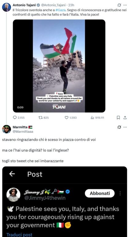 Mohammed è perfettamente consapevole dell’uso del suo video con la bandiera italiana da parte di testi. Lo ha fatto notare nei commenti al post Instagram di Tajani, contestando la pubblicazione del filmato in quanto fatta senza il suo consenso e chiedendo che venisse rimosso o che fosse indicato come autore originale: