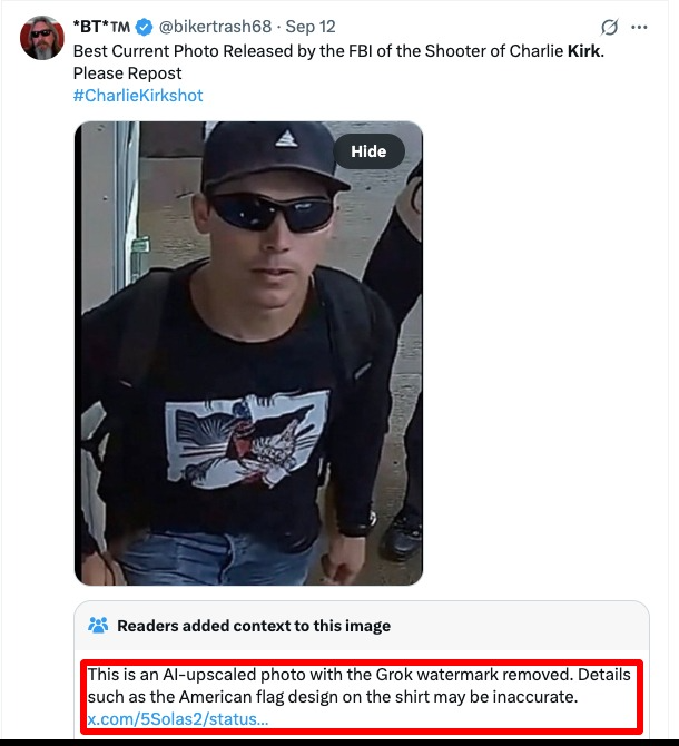 L’assassinio di Charlie Kirk, avvenuto il 10 settembre 2025 durante un evento pubblico alla Utah Valley University, ha scatenato un’ondata di fake news che non accenna a scemare. Tra le più virali, quelle sul colpevole. Le immagini diffuse dall’FBI dopo l’accaduto erano parecchio sgranate, il che ha portato numerosi utenti a migliorarle con l’intelligenza artificiale. Questa operazione ne ha alterato i tratti, generando confusione e sospetti infondati sull’identità del responsabile.