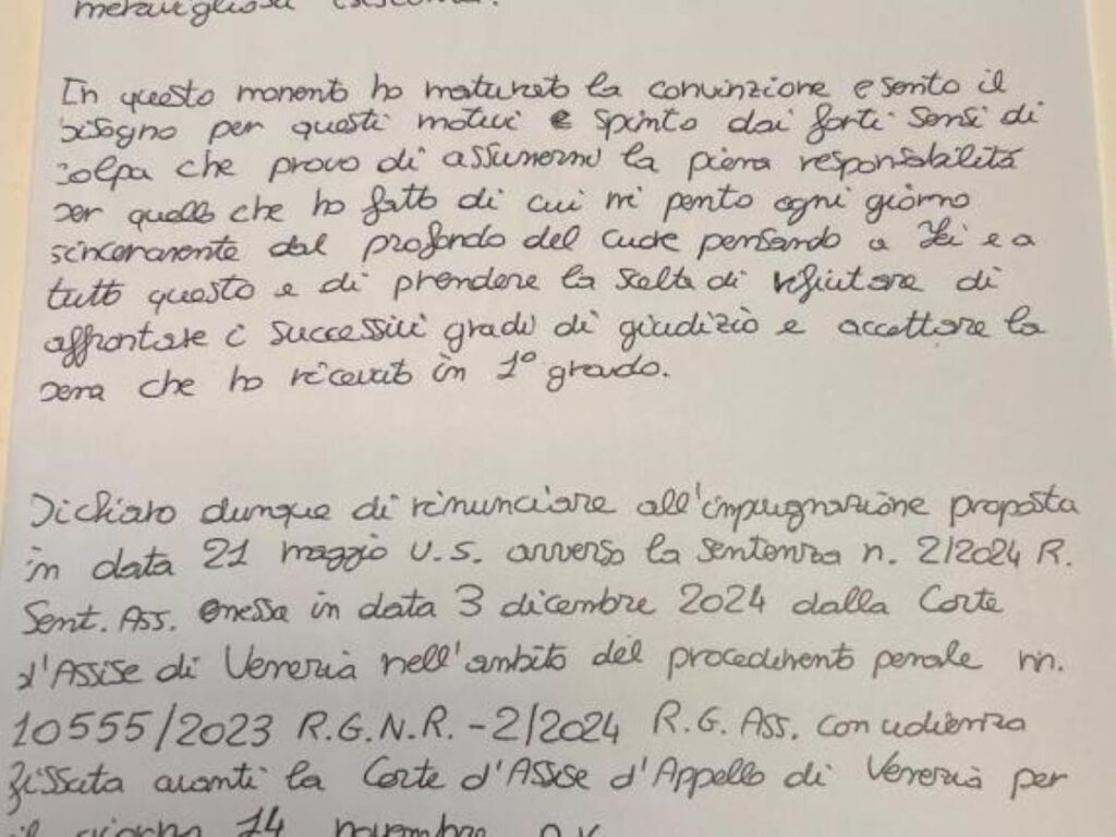 È una pagina scritta di suo pugno quella con cui Filippo Turetta rinuncia al ricorso in appello. La notizia era già stata diramata, ma ora è possibile conoscere le parole esatte con cui il ragazzo, dal carcere di Verona dove è detenuto, ha comunicato la sua decisione di ritirare l’impugnazione proposta lo scorso 21 maggio. Con questa decisione Turetta ha dichiarato di accettare l’ergastolo, ma la sua sentenza sarà comunque ancora oggetto di discussione in tribunale il mese prossimo. La Procura di Venezia infatti intende dar seguito al procedimento affinché siano riconosciute le aggravanti di crudeltà e stalking, che la Corte d’assise aveva escluso in primo grado.