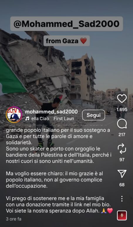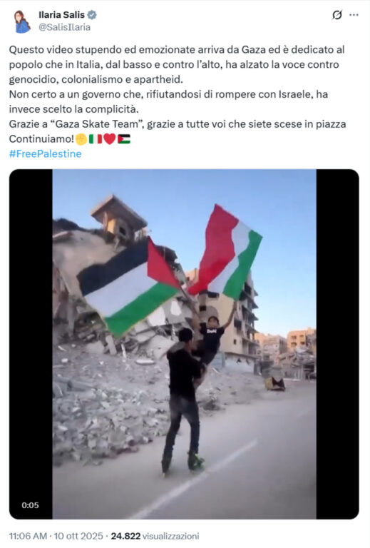 Nel suo post, Ilaria Salis ringrazia il gruppo “Gaza Skate Team” condividendo il video di Mohammed di “Gaza Freedom Skaters“.