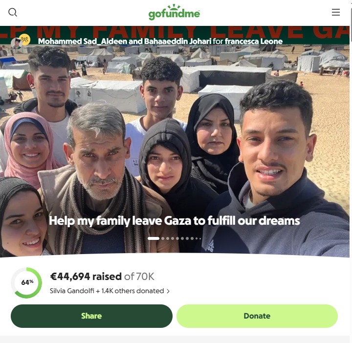 Il link nella biografia rimanda a una raccolta fondi sulla piattaforma GoFundMe, dove Mohammed spiega di voler portare in salvo la sua famiglia, composta da otto persone, attraversando il confine con l’Egitto tramite una compagnia di nome “Hala”, che gestirebbe le evacuazioni. Secondo quanto riporta nella descrizione della raccolta fondi, l’Egitto avrebbe regolamentato i costi di attraversamento pari a 5.000 dollari a persona. L’obiettivo della campagna di Mohammed per la sua famiglia è attualmente di 70 mila euro, di cui circa 44 mila già raccolti.