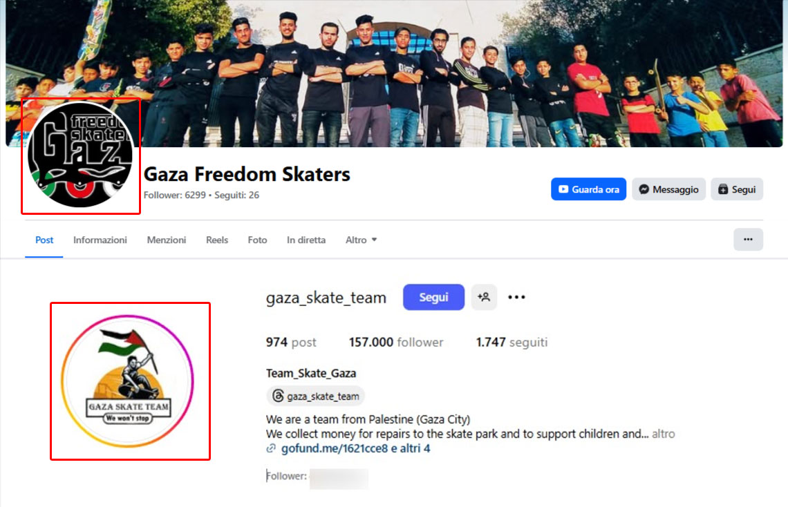 Da come possiamo notare, i nomi e i loghi dei due gruppi risultano diversi: quello legato a Mohammed riporta il disegno di un roller, quello di “Gaza Skate Team” un ragazzo con il suo skateboard.