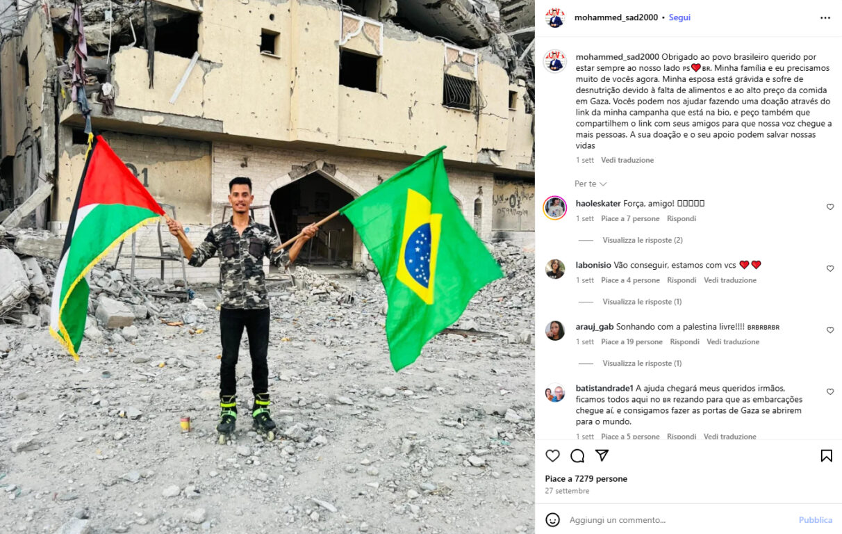Oltre a lasciare un watermark utile a tutelare il copyright, questa volta riporta un commento politico e di critica contro il governo italiano, cosa che non aveva fatto in precedenza. Alla fine del post, rilancia la raccolta fondi per la sua famiglia, utile per lasciare Gaza.