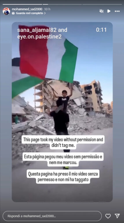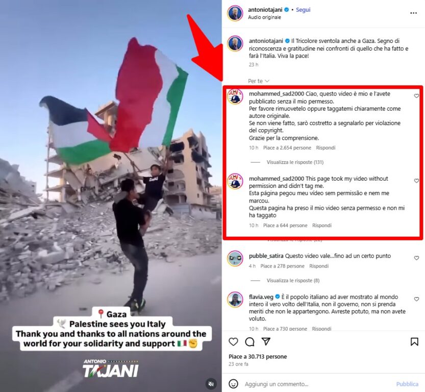 Mohammed è perfettamente consapevole dell’uso del suo video con la bandiera italiana da parte di testi. Lo ha fatto notare nei commenti al post Instagram di Tajani, contestando la pubblicazione del filmato in quanto fatta senza il suo consenso e chiedendo che venisse rimosso o che fosse indicato come autore originale: