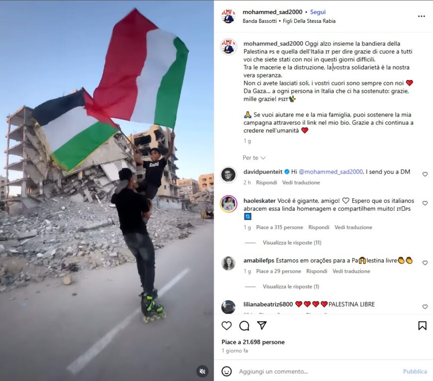 Oggi alzo insieme la bandiera della Palestina e quella dell’Italia per dire grazie di cuore a tutti voi che siete stati con noi in questi giorni difficili. Tra le macerie e la distruzione, la vostra solidarietà è la nostra vera speranza. Non ci avete lasciati soli, i vostri cuori sono sempre con noi. Da Gaza… a ogni persona in Italia che ci ha sostenuto: grazie, mille grazie!
